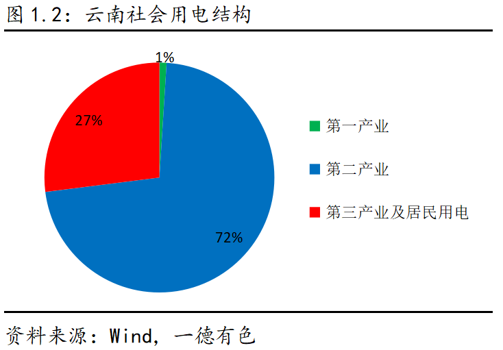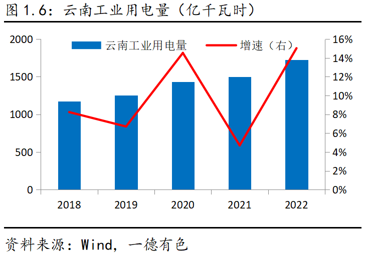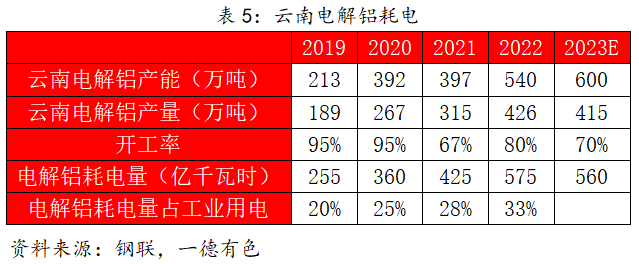 電解鋁行業(yè)屬于高耗能企業(yè),生產(chǎn)一噸電解鋁綜合電耗13500度電,前期云南地區(qū)以綠電優(yōu)勢(shì)招商引資,使得從2018年開始神火、其亞和魏橋?qū)⑵潆娊怃X產(chǎn)能陸續(xù)轉(zhuǎn)移至云南。2019年云南電解鋁耗電量255萬千瓦時(shí),占工業(yè)用電20%,至2022年電解鋁耗電量增加至575萬千瓦時(shí),占工業(yè)用電達(dá)到33%,復(fù)合增長(zhǎng)率達(dá)到31%。