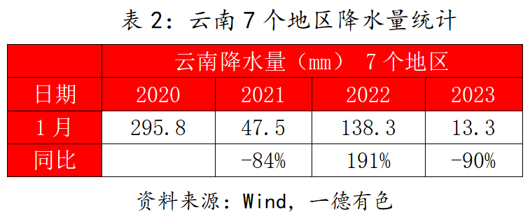 根據(jù)對(duì)云南7個(gè)地區(qū)降水量統(tǒng)計(jì),2022年云南降水量5942mm,同比減少1.7%。2023年1月云南降水量?jī)H有13.3%,同比減少90%,三峽及溪洛渡蓄水量低于往年同期超30%。此外在經(jīng)過3年拉尼娜之后,NOAA中性預(yù)測(cè)模型之下,厄爾尼諾現(xiàn)象于明年三季度開始的概率為60%,這將造成云南地區(qū)降水量減少甚至面臨干旱的局面。