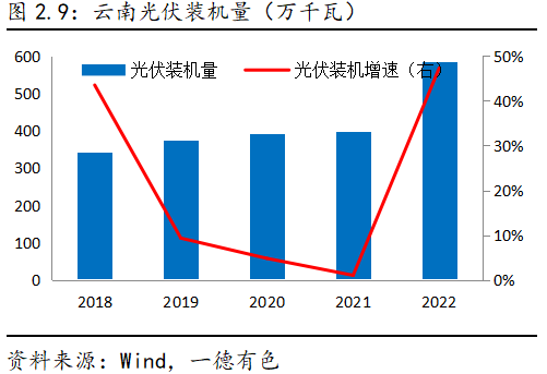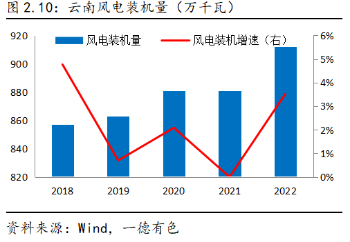 2022年云南風(fēng)電發(fā)電量214.3億千瓦時(shí),同比減少8%,占云南發(fā)電量的5.6%,風(fēng)電裝機(jī)量912萬千瓦。光伏發(fā)電量37.5億千瓦時(shí),同比增加3.1%,占云南發(fā)電量的1%,光伏裝機(jī)量585萬千瓦。