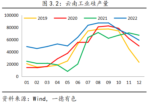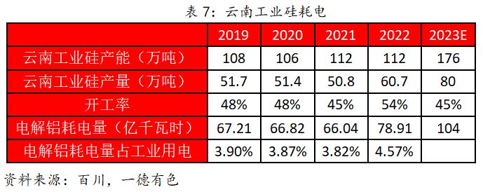 工業(yè)硅目前尚未明確屬于高耗能企業(yè),生產(chǎn)一噸工業(yè)硅綜合電耗12800-13000度電,過去四年云南地區(qū)工業(yè)硅產(chǎn)能少有擴(kuò)建,不過2023年是工業(yè)硅新增產(chǎn)能大年,預(yù)計(jì)將有超60萬噸新增產(chǎn)能投放。不過工業(yè)硅用電量占云南工業(yè)用電比例較小,且生產(chǎn)彈性較大,過去幾年整體開工率維持在5成左右。因此若出現(xiàn)用電緊張的情況,雖然將對(duì)云南供應(yīng)產(chǎn)生影響,但工業(yè)硅價(jià)格走勢(shì)更依賴于當(dāng)時(shí)的供需平衡關(guān)系,而非對(duì)限電的炒作。
